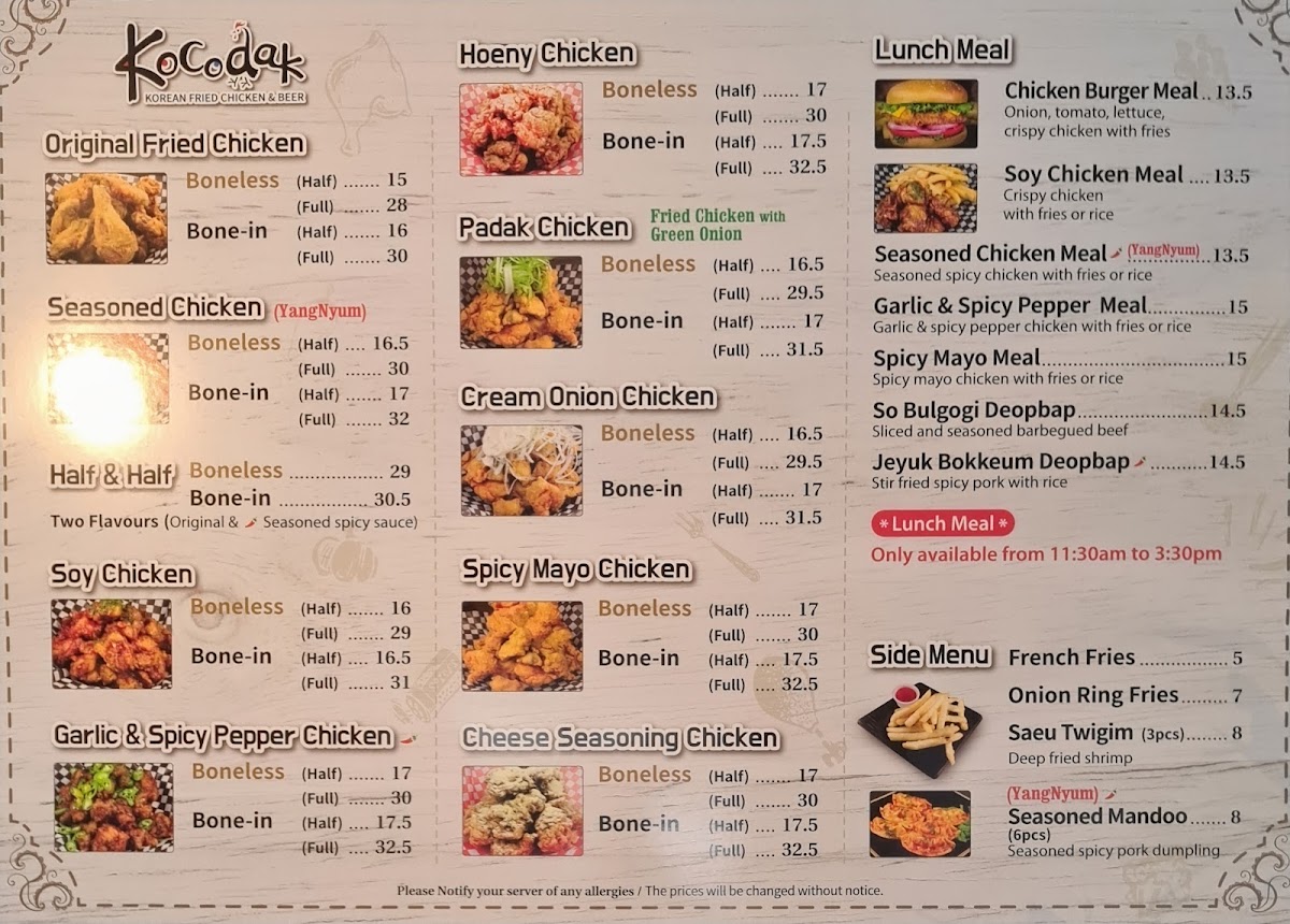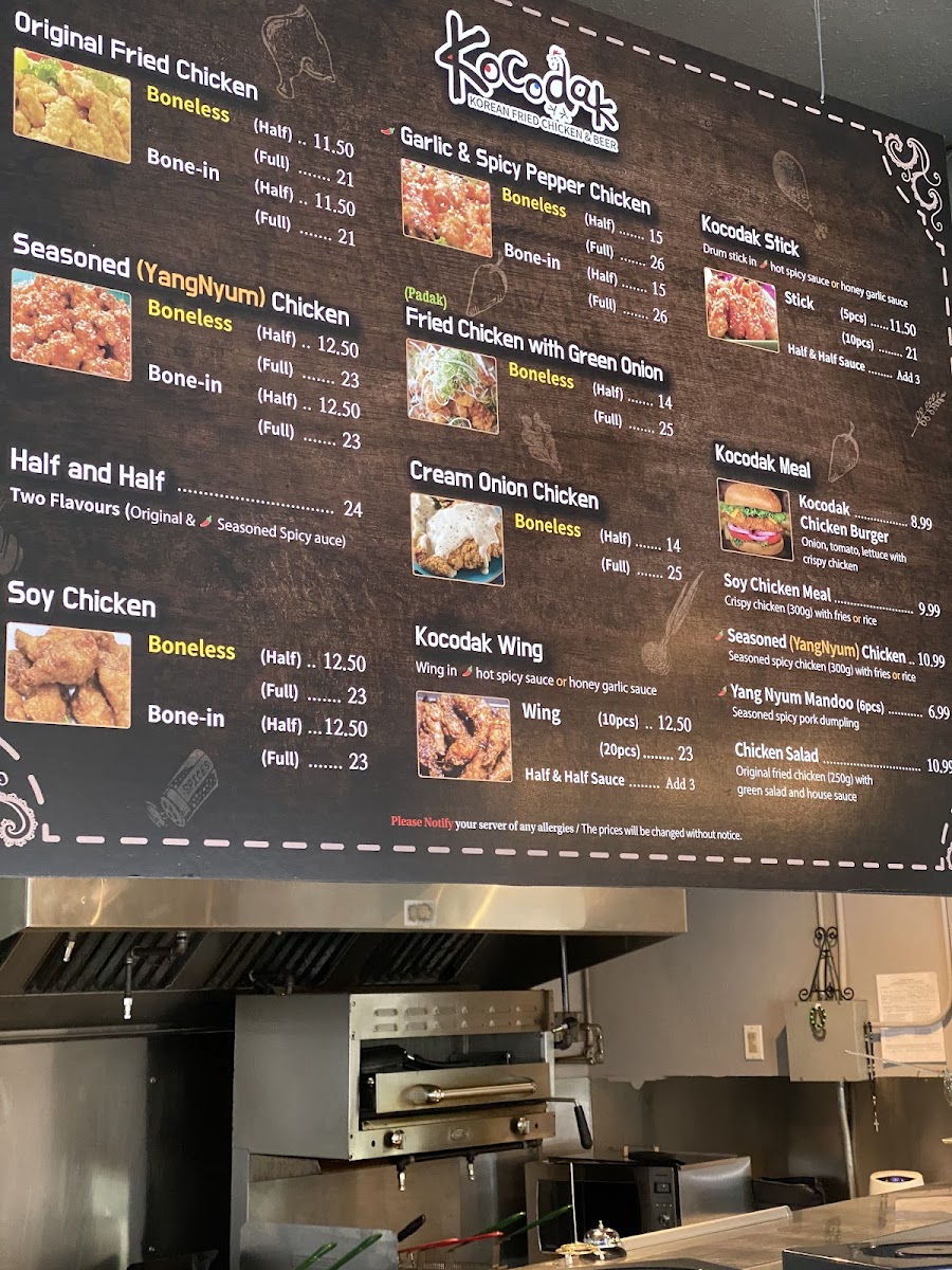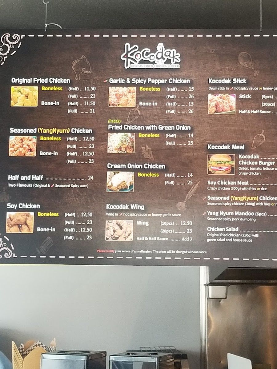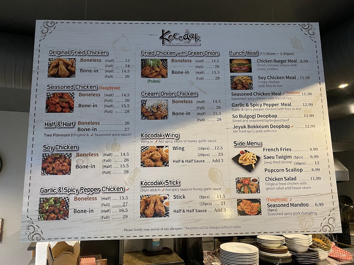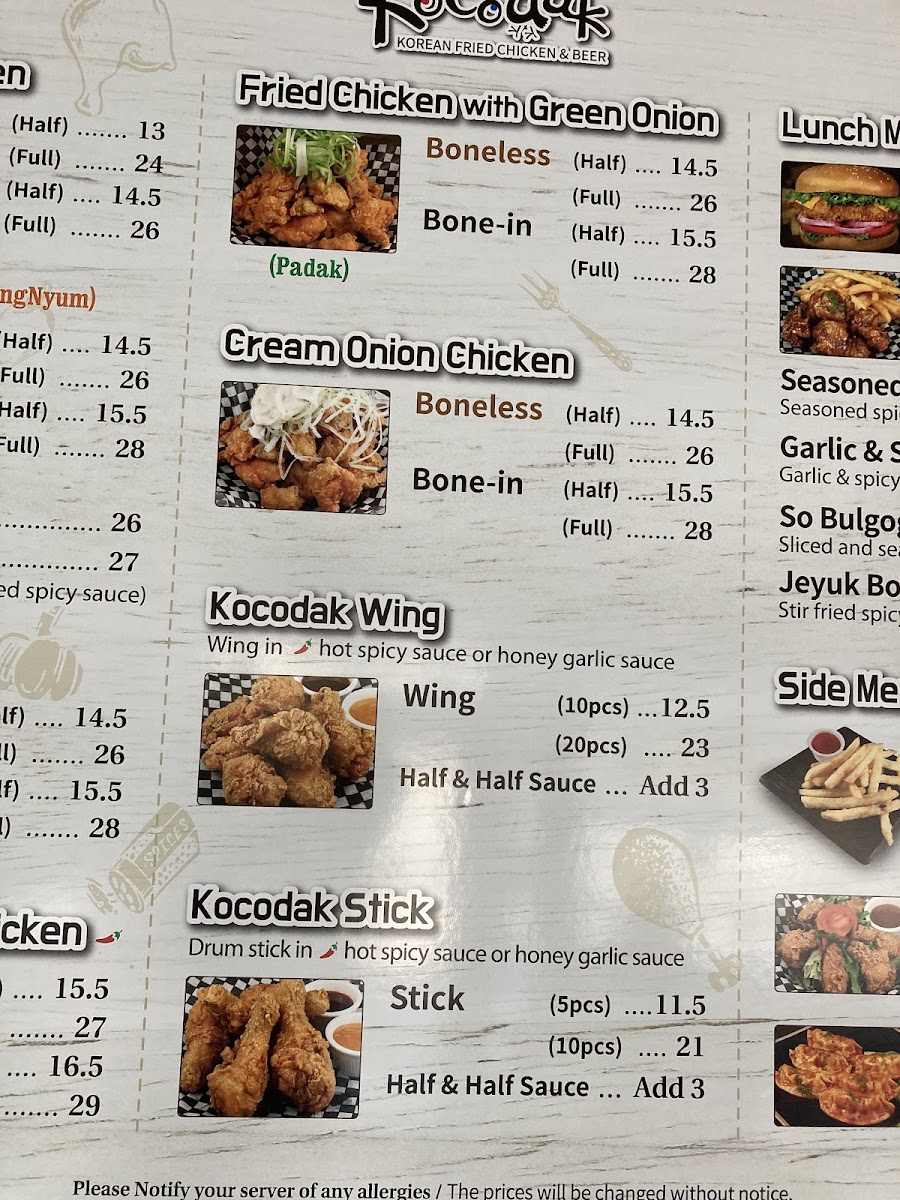 The menu at Kocodak Chicken & Bar offers a wide variety of delicious chicken dishes that cater to all tastes, with options for both bone-in and boneless preparations. For those who enjoy soy-flavored chicken, they can choose from Bone-In Soy Full ($17.99), Boneless Soy Full ($17.99), Boneless Soy Half ($11.99), and Bone-In Soy Half ($11.99). Fans of the original flavor can opt for the Bone-In Original Full ($17.99), Boneless Original Full ($17.99), Boneless Original Half ($11.99), or Bone-In Original Half ($11.99). For something with a creamy twist, the Boneless Cream Onion Chicken Full ($19.99) and Bone-In Cream Onion Chicken Half ($12.99) offer a rich, savory option. The Cheese Seasoning variety is also popular, with choices like Bone-In Cheese Seasoning Full ($18.99) and Boneless Cheese Seasoning Half ($12.99). Those craving a little more heat can enjoy the Bone-In Garlic & Spicy Pepper Chicken Full ($18.99) or the Boneless Garlic & Spicy Pepper Chicken Half ($12.99), among other variations. For a hearty meal, the Chicken Burger Meal ($11.99) is a great option, while lunch specials like the Soy Chicken Meal ($12.99) and Garlic & Spicy Pepper Chicken Meal ($12.99) are perfect for those looking for a satisfying mid-day bite. The menu also features sides such as French Fries ($4.99), Yangnyum Mandoo (6 Pieces) ($6.99), and Onion Rings ($5.99), along with additional condiments like Side Cream Onion and Yangnyum Sauce ($1.99 each). For those who enjoy variety, the Half & Half options, such as Bone-In Half & Half ($18.99) and Boneless Half & Half ($18.99), are a perfect choice. With a mix of sweet, savory, and spicy options, Kocodak Chicken & Bar offers something for everyone.