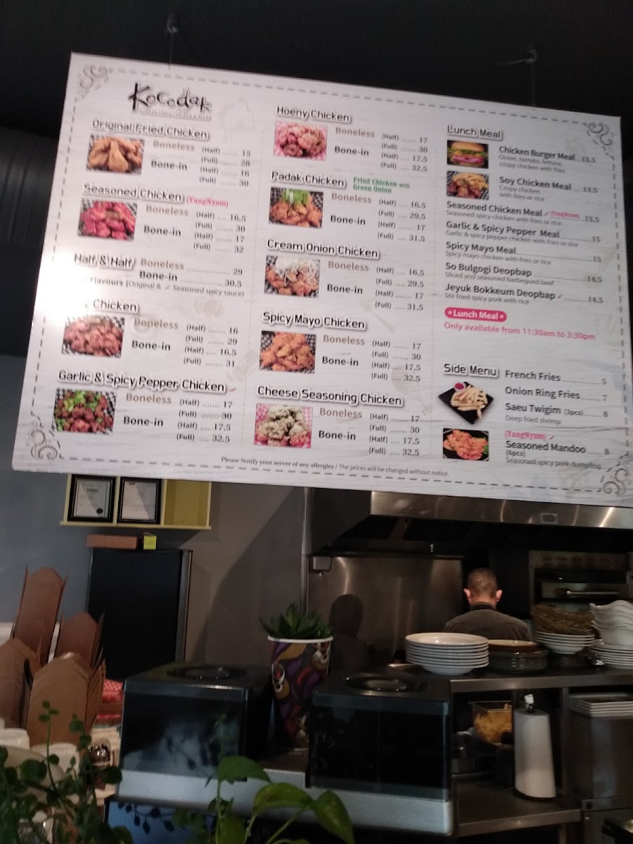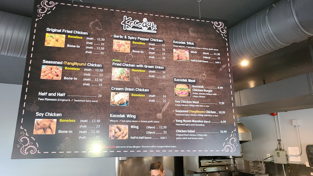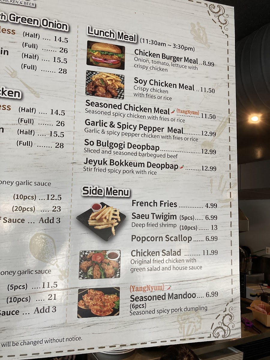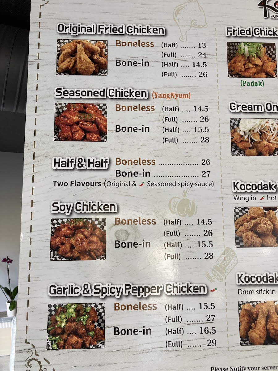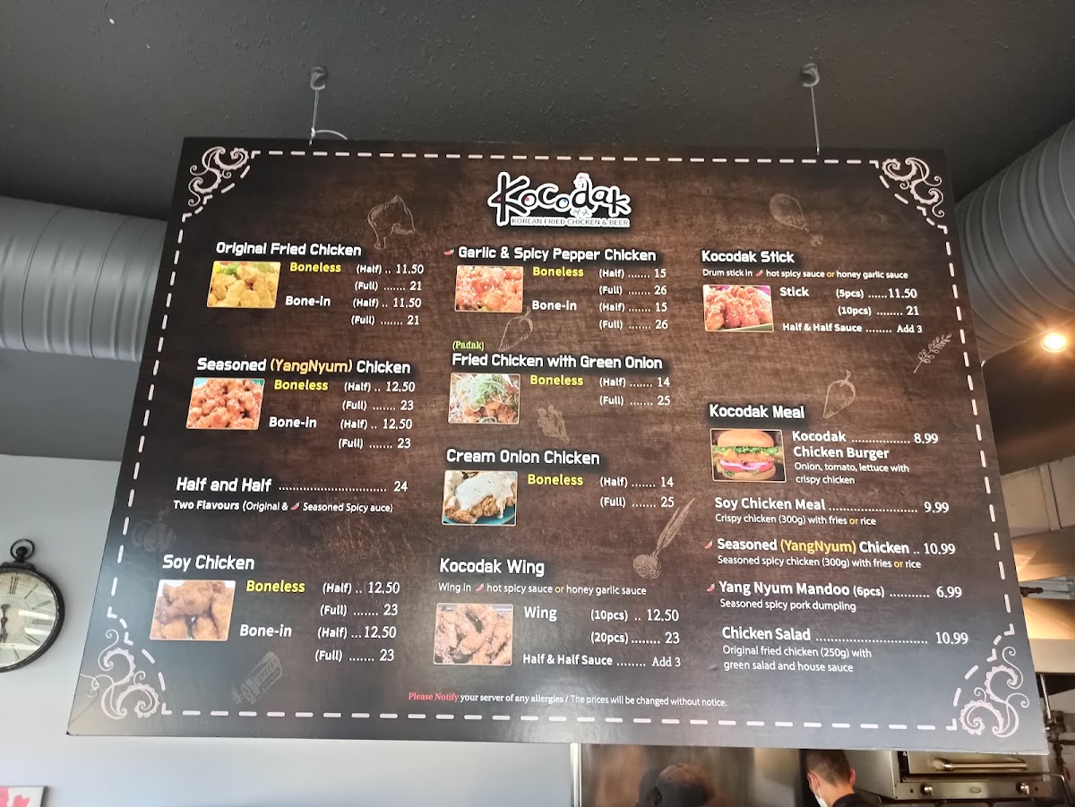 The menu at Kocodak Chicken & Bar offers a wide variety of delicious chicken dishes that cater to all tastes, with options for both bone-in and boneless preparations. For those who enjoy soy-flavored chicken, they can choose from Bone-In Soy Full ($17.99), Boneless Soy Full ($17.99), Boneless Soy Half ($11.99), and Bone-In Soy Half ($11.99). Fans of the original flavor can opt for the Bone-In Original Full ($17.99), Boneless Original Full ($17.99), Boneless Original Half ($11.99), or Bone-In Original Half ($11.99). For something with a creamy twist, the Boneless Cream Onion Chicken Full ($19.99) and Bone-In Cream Onion Chicken Half ($12.99) offer a rich, savory option. The Cheese Seasoning variety is also popular, with choices like Bone-In Cheese Seasoning Full ($18.99) and Boneless Cheese Seasoning Half ($12.99). Those craving a little more heat can enjoy the Bone-In Garlic & Spicy Pepper Chicken Full ($18.99) or the Boneless Garlic & Spicy Pepper Chicken Half ($12.99), among other variations. For a hearty meal, the Chicken Burger Meal ($11.99) is a great option, while lunch specials like the Soy Chicken Meal ($12.99) and Garlic & Spicy Pepper Chicken Meal ($12.99) are perfect for those looking for a satisfying mid-day bite. The menu also features sides such as French Fries ($4.99), Yangnyum Mandoo (6 Pieces) ($6.99), and Onion Rings ($5.99), along with additional condiments like Side Cream Onion and Yangnyum Sauce ($1.99 each). For those who enjoy variety, the Half & Half options, such as Bone-In Half & Half ($18.99) and Boneless Half & Half ($18.99), are a perfect choice. With a mix of sweet, savory, and spicy options, Kocodak Chicken & Bar offers something for everyone.